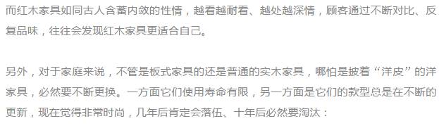 从某种意义上讲红木家具也是 对现今大量生产,大量消费,用了就扔的消费文化方式的一种否定。