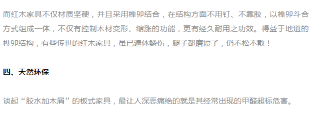而红木家具选用天然材料,采用传统工艺,榫卯结构,天然生漆,不含甲醛、苯等有害物质,天然环保!