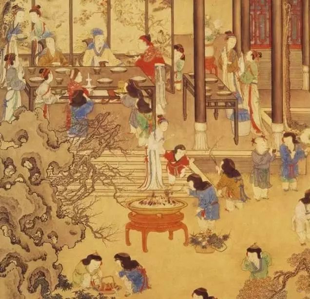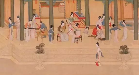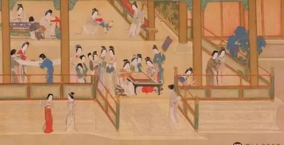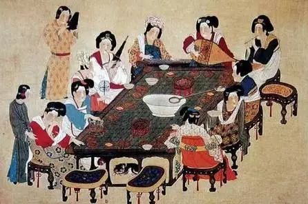 唐周昉《宮樂圖》——畫中餐桌踢打渾厚,裝飾華麗。貴婦們座下是月牙凳,凳面略有弧度,符合人體工學