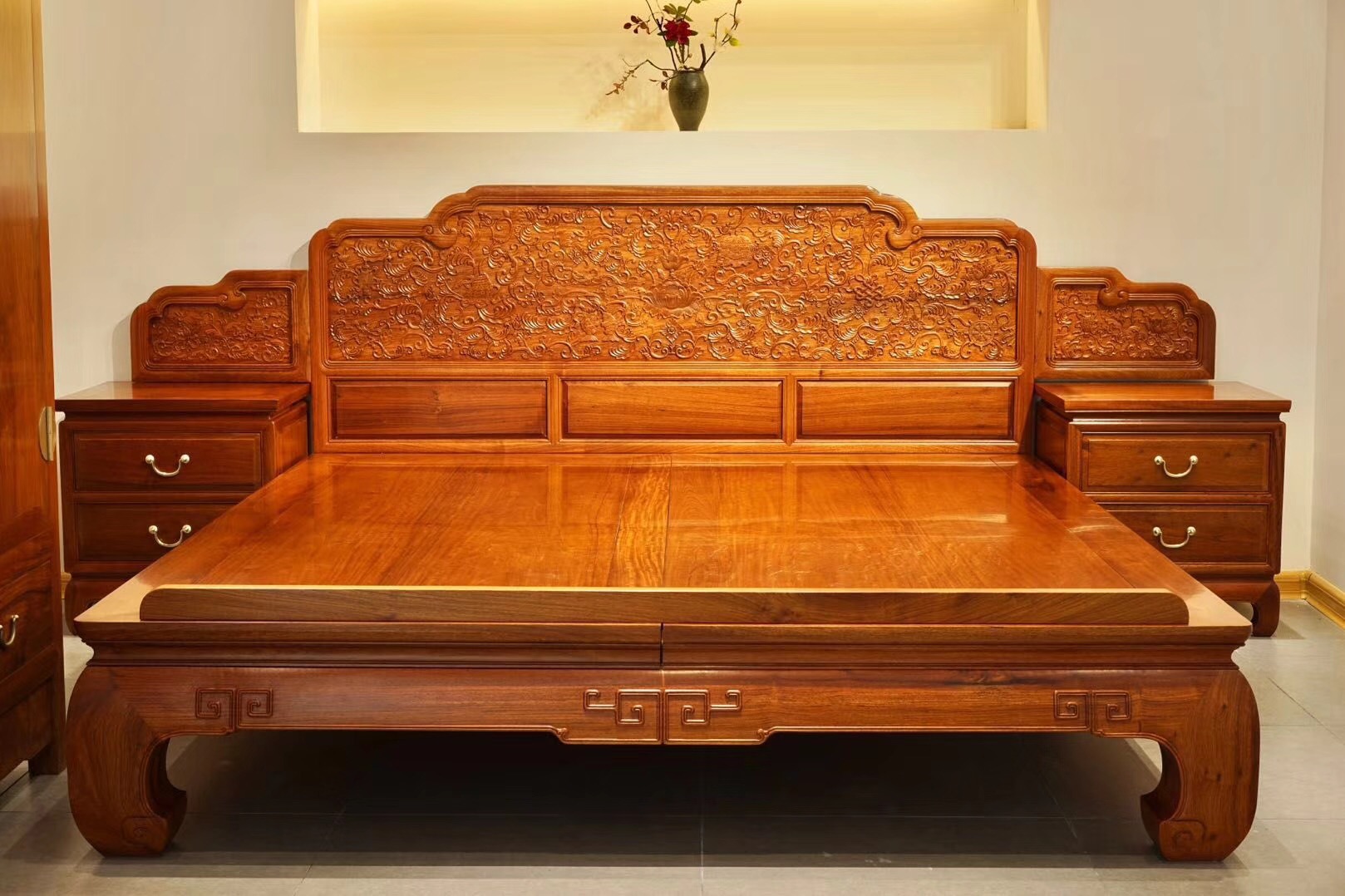 2.纹路,就缅甸花梨木材来说,除了木材本身有一股淡淡的果香味之外,其独特的虎皮纹也是很多人的喜好,面板满是虎皮纹的比没有这种虎皮纹的家具要贵很多,这也是价格差异的一个因素