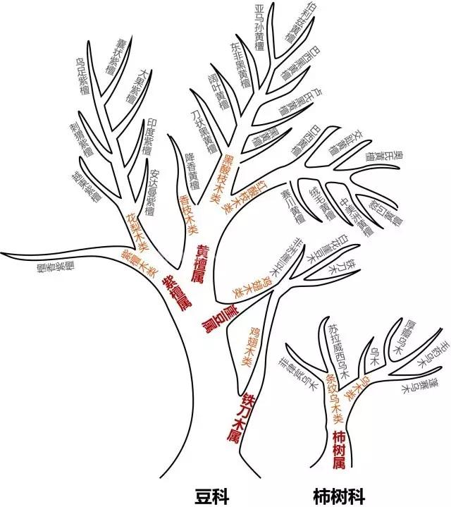 市面上红木材质称谓繁多,让人云里雾里,国家根据密度等指标早已对红木进行了规范,把红木规范为:二科、五属、八类、三十三种。所以,除了下图中三十三种木材,其它的都不能称为红木。