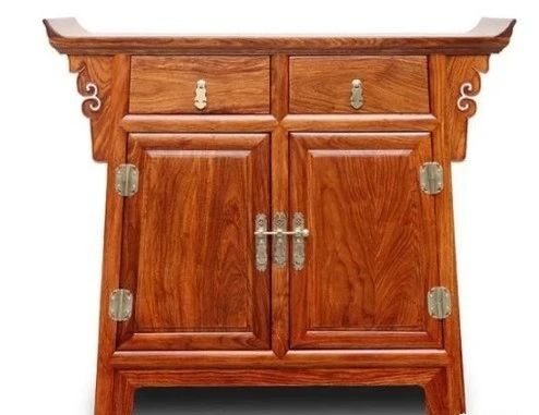 该款红木产品的材质为紫光檀,整体为素面设计,让家具显得简约大气。设计规格:神台长150cm、宽40cm、高80cm;花架长40cm、宽40cm、高100cm。产品为三件套,神台一件,花架两件。产品售价75000。
